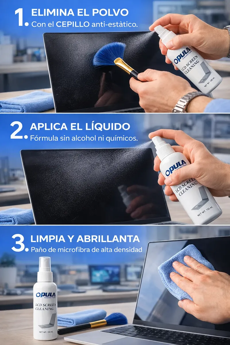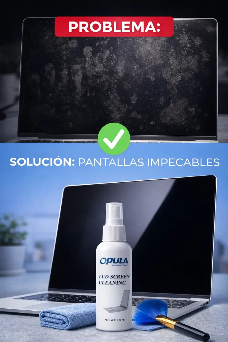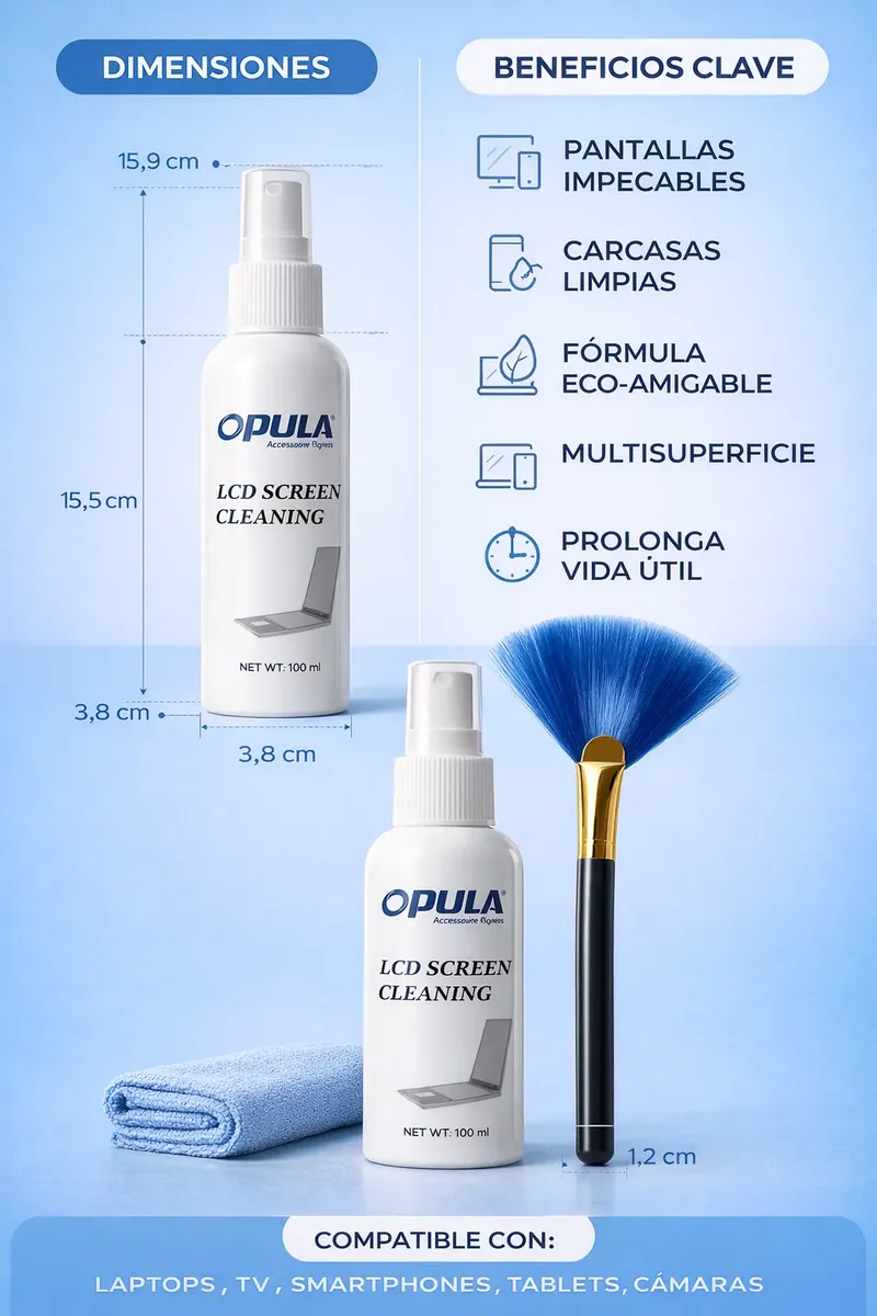 ¡MANTÉN TUS PANTALLAS COMO NUEVAS CON LA TECNOLOGÍA DE OPULA! ¿Cansado de las huellas y el polvo en tu equipo? El Kit de Limpieza Opula KCL-1029 es la solución definitiva para el cuidado de tus dispositivos electrónicos. Diseñado especialmente para el mercado tecnológico actual, este kit elimina la suciedad sin dañar las capas protectoras de tus pantallas. ¿POR QUÉ ELEGIR ESTE KIT? Limpieza Segura: Fórmula sin alcohol ni solventes agresivos. No daña el recubrimiento de tu MacBook, Smart TV o Smartphone. Acabado Profesional: Olvídate de las rayas y vetas. El líquido es de secado rápido y deja una capa protectora invisible. Acción 3 en 1: La brocha elimina el polvo acumulado, el spray desintegra la grasa y el paño de microfibra pule para un brillo impecable.