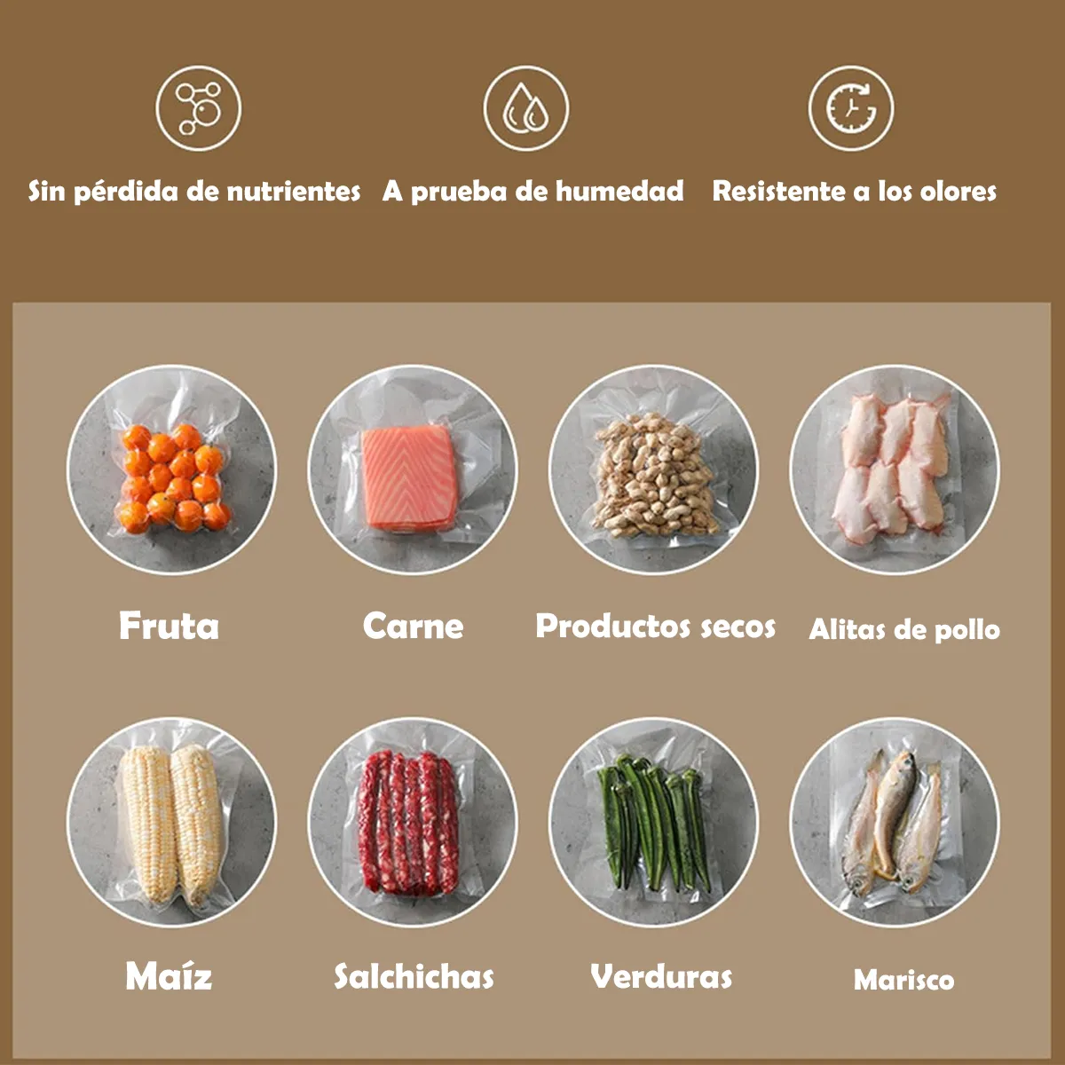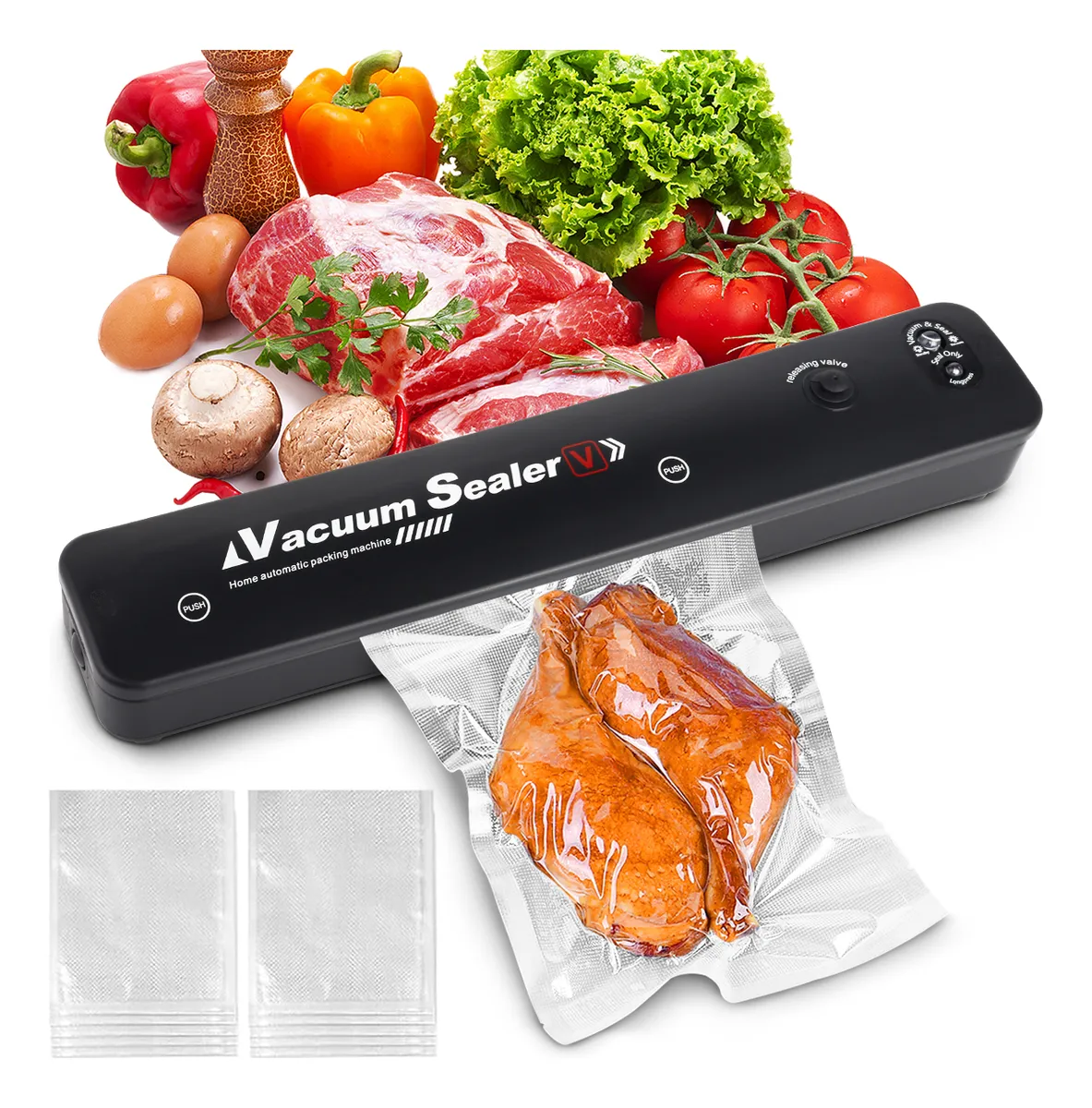 El sistema de sellado al vacío mantiene los alimentos frescos hasta 7 veces más. El sellador al vacío de alimentos elimina el aire de bolsas especialmente diseñadas. Sellado térmico de material multicapa para mantener el aire fuera y evitar quemaduras en el congelador, reduce el deterioro y el desperdicio de alimentos. Y cocinar y preparar la comida será más fácil, más económico y más rápido.