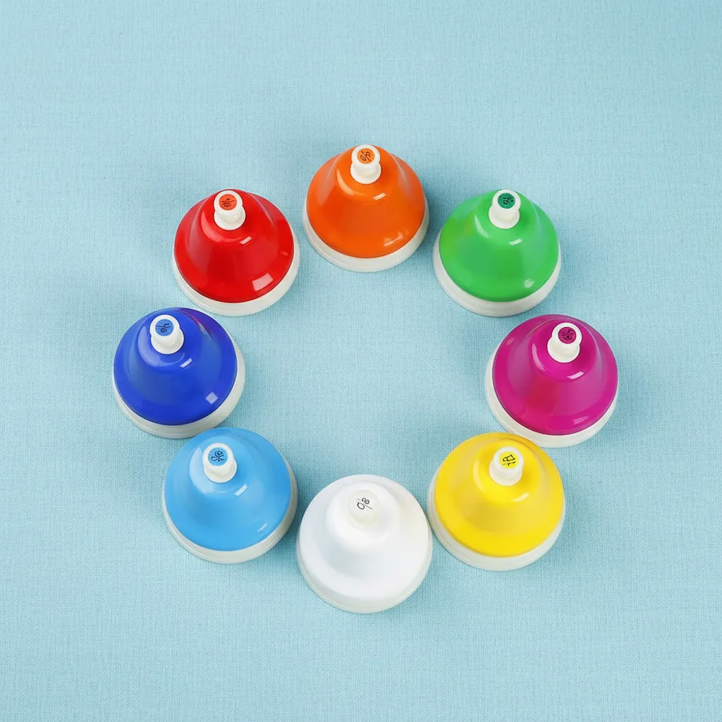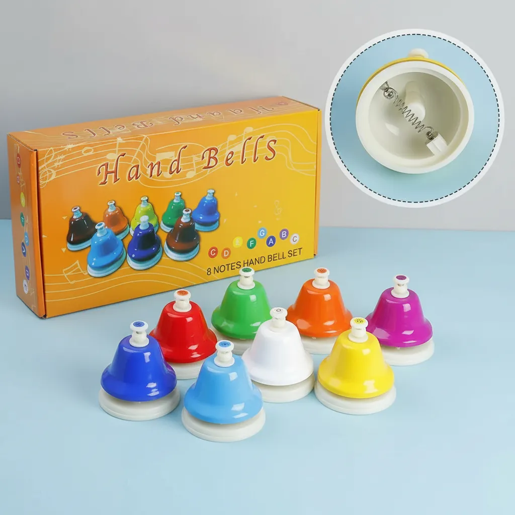 8 campanas en un juego hechas de metal duraderas exquisitas atractivas Posición correspondiente de nota y escala en la parte superior de las campanas proporcionando orientación en juego fácil de jugar sintonizar suenan fuerte y claramente 8 tono en Do mayor: C,D,E,F,G,A,B,C Buen instrumento para que los niños desarrollen su gran coordinación e inteligencia musical